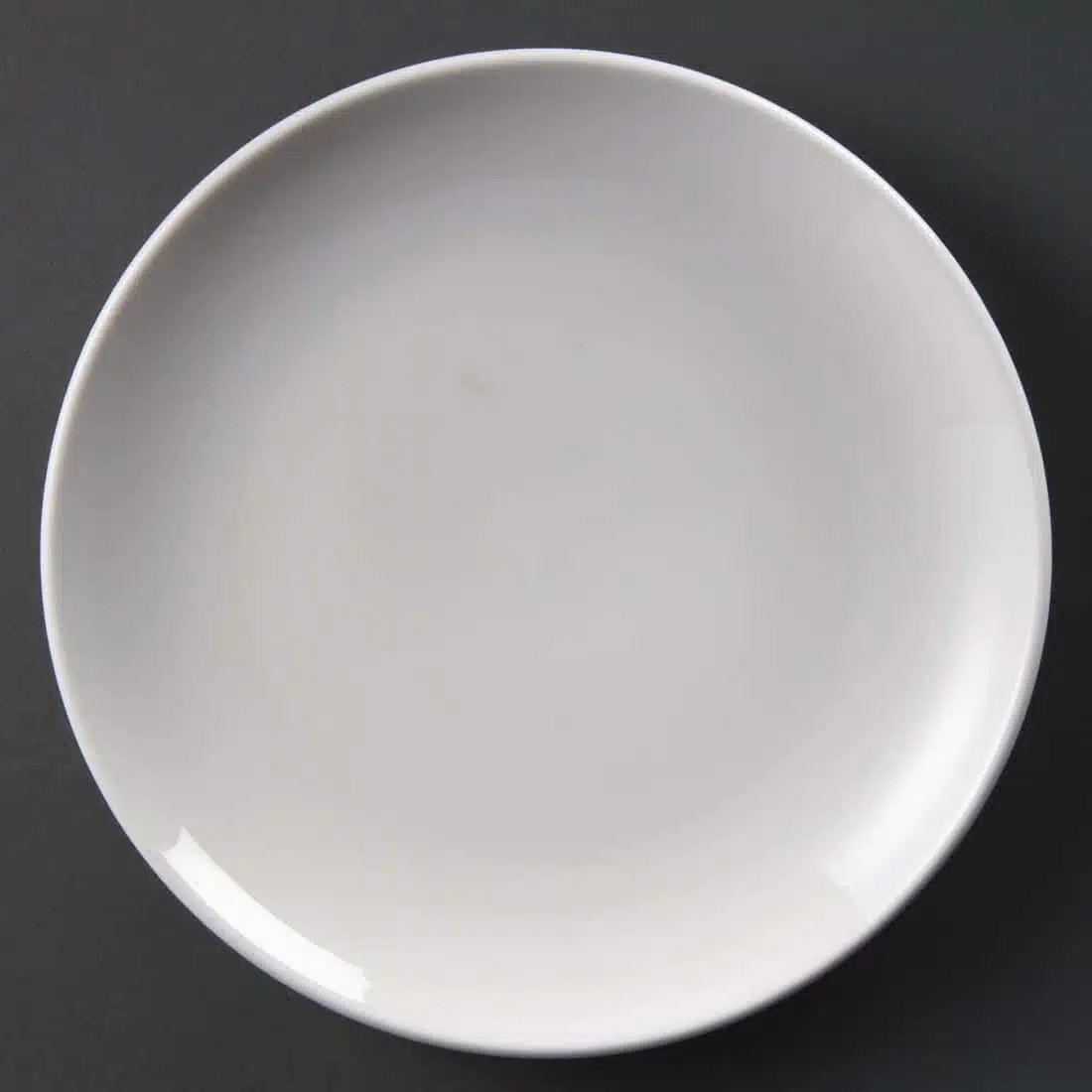 An appealing, pure white 9″ coupe plate from Olympia, designed to provide a great value and hardwearing porcelain crockery solution for busy hotels, canteens, casual dining restaurants and cafes. Strengthened rolled edges ensure the plate is chip resistant and the fully vitrified body gives great glaze durability, making it ideal to withstand the rigours of the professional catering environment. The plate is stackable, helping maximise storage space, and oven, microwave, dishwasher and freezer proof.