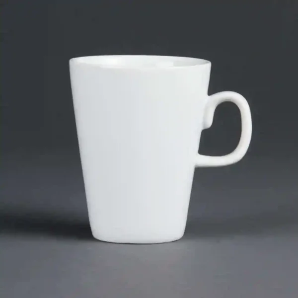 Great value pure white porcelain latte mugs by Olympia, with the added advantage of stackability and strengthened rolled edges for chip resistance.