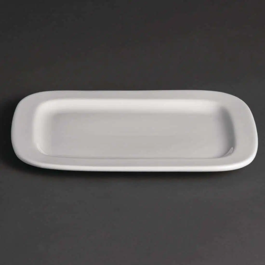 An appealing, pure white rectangular plate from Olympia, designed to provide a great value and hardwearing porcelain crockery solution for busy hotels, canteens, casual dining restaurants and cafes. Strengthened rolled edges ensure the plate is chip resistant and the fully vitrified body gives great glaze durability, making it ideal to withstand the rigours of the professional catering environment. The plate is stackable, helping maximise storage space, and oven, microwave, dishwasher and freezer proof.