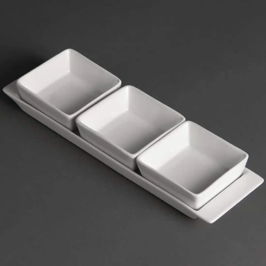 Appealing, pure white snack dishes and plate from Olympia, designed to provide a great value and hardwearing porcelain crockery solution for busy hotels, canteens, casual dining restaurants and cafes. Strengthened rolled edges ensure the both the dishes and plate are chip resistant, and the fully vitrified body gives great glaze durability, making them ideal to withstand the rigours of the professional catering environment. The dishes and plate are oven, microwave, dishwasher and freezer proof.