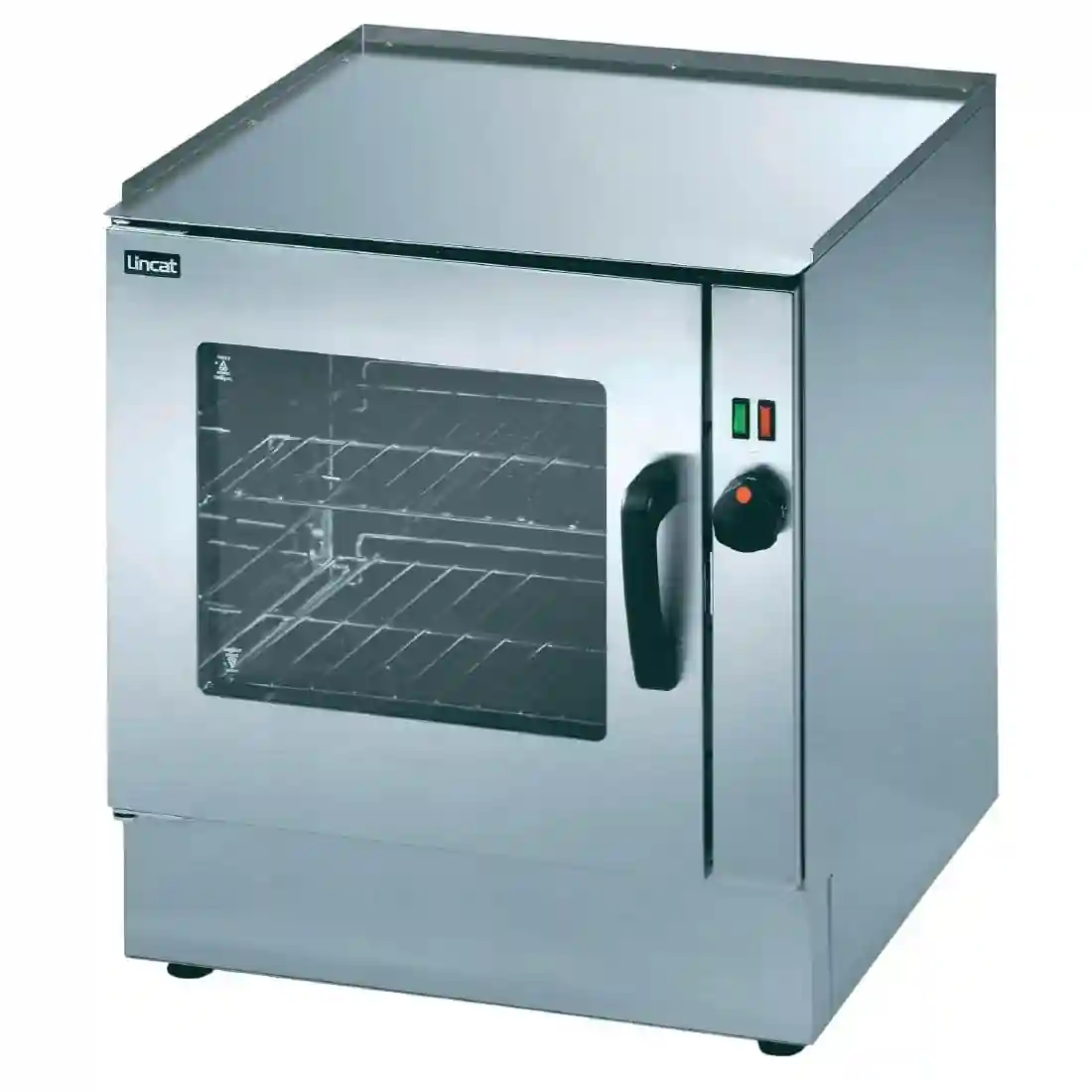 A heavy duty Silverlink 600 convection oven with double glazed glass door for easy viewing by Lincat provides excellent performance and capacity whilst operating from a 13amp plug. The fan assisted models offer reduced cooking times and optimum efficiency. The vitreous enamelled interior with radiused corners and removable side shelf supports easy cleaning, while the side opening doors, with robust hinges and ball catch give it safe and easy access. It is able to support suitably sized Silverlink countertop units, such as boiling tops, bain maries, griddles and work tops.