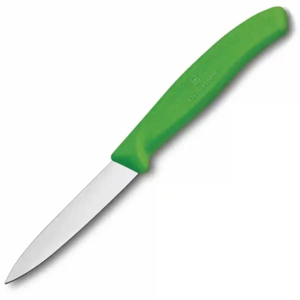 The Victorinox 8cm fine quality paring knife is ideal for peeling, or chopping smaller vegetables. Made from stainless steel, this knife is dishwasher safe and durable. The nylon soft-grip handle is colour coded green, so it’s easy to identify to help prevent cross contamination in the kitchen. The pointed tip makes intricate work easy.