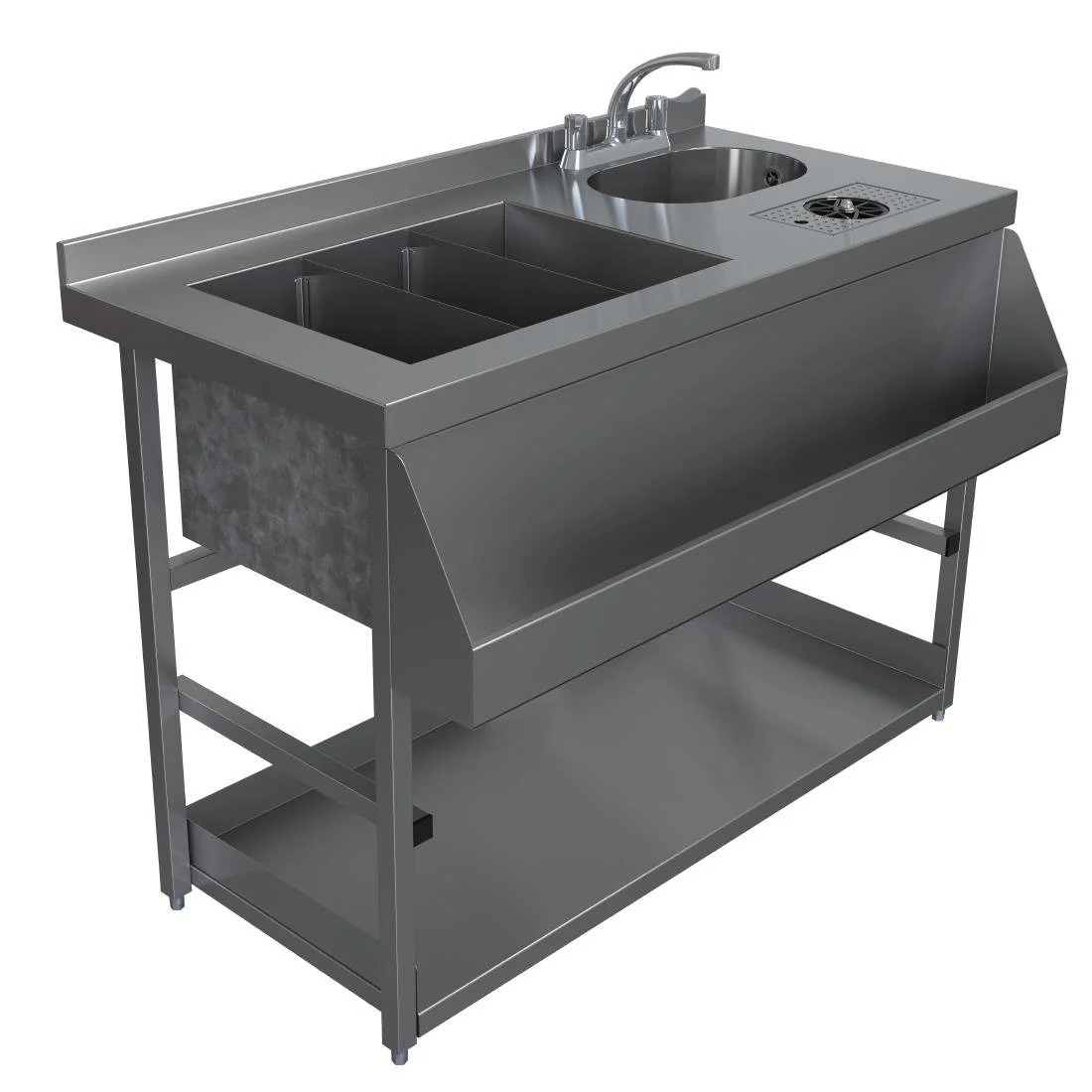 Finally, on top, the cocktail station includes fully stainless steel construction for durability and ease of cleaning.