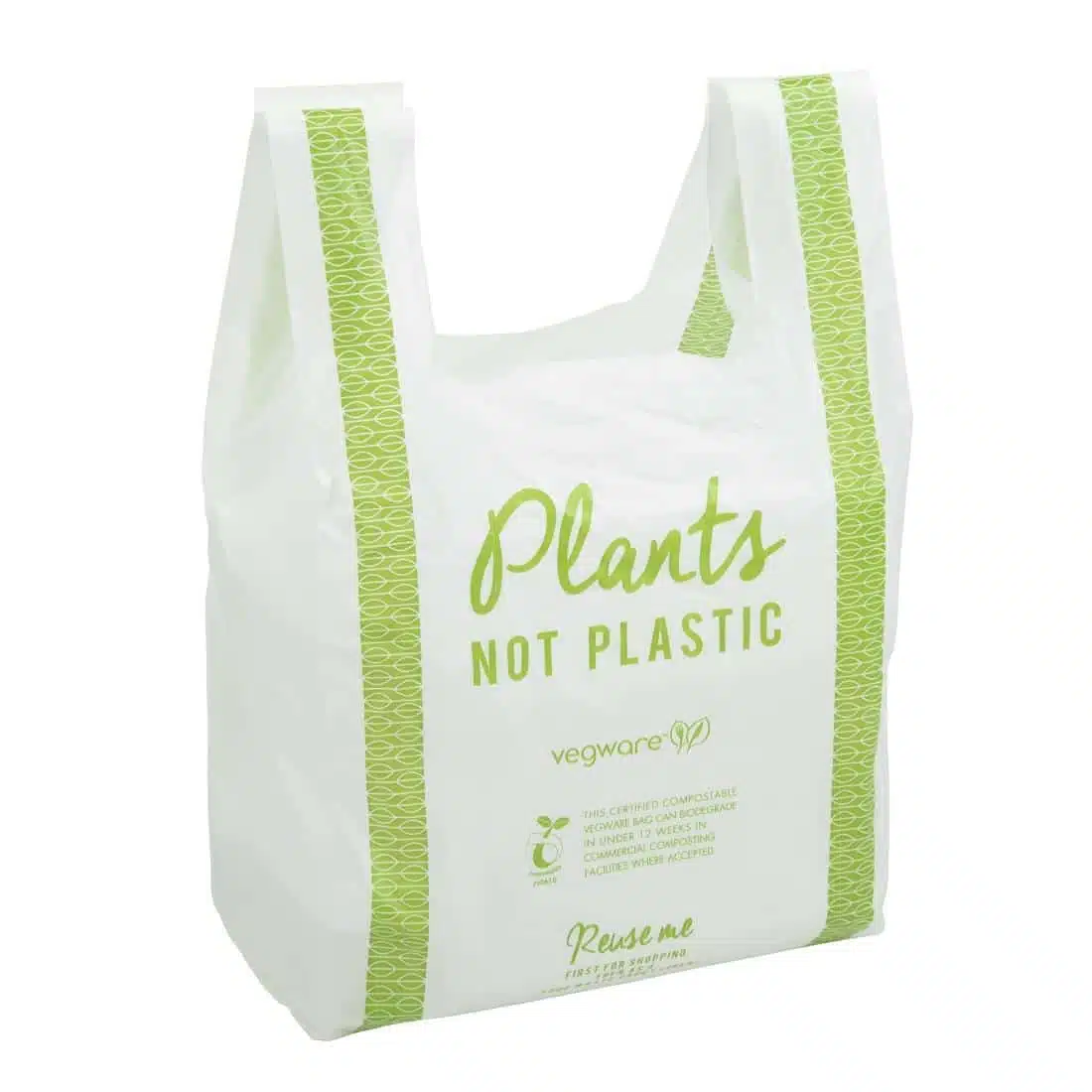 Offer your customers an environmentally friendly substitute to traditional plastic bags with these Vegware compostable PLA carrier bags. Made from a blend of renewable, plant-based PLA and PBAT, the bags are commercially compostable within 12 weeks and kinder to the planet than standard plastic alternatives. As such, switching to these bags is a great way to minimise your environmental impact, divert waste away from harmful landfill sites and show customers you really care about important global issues.