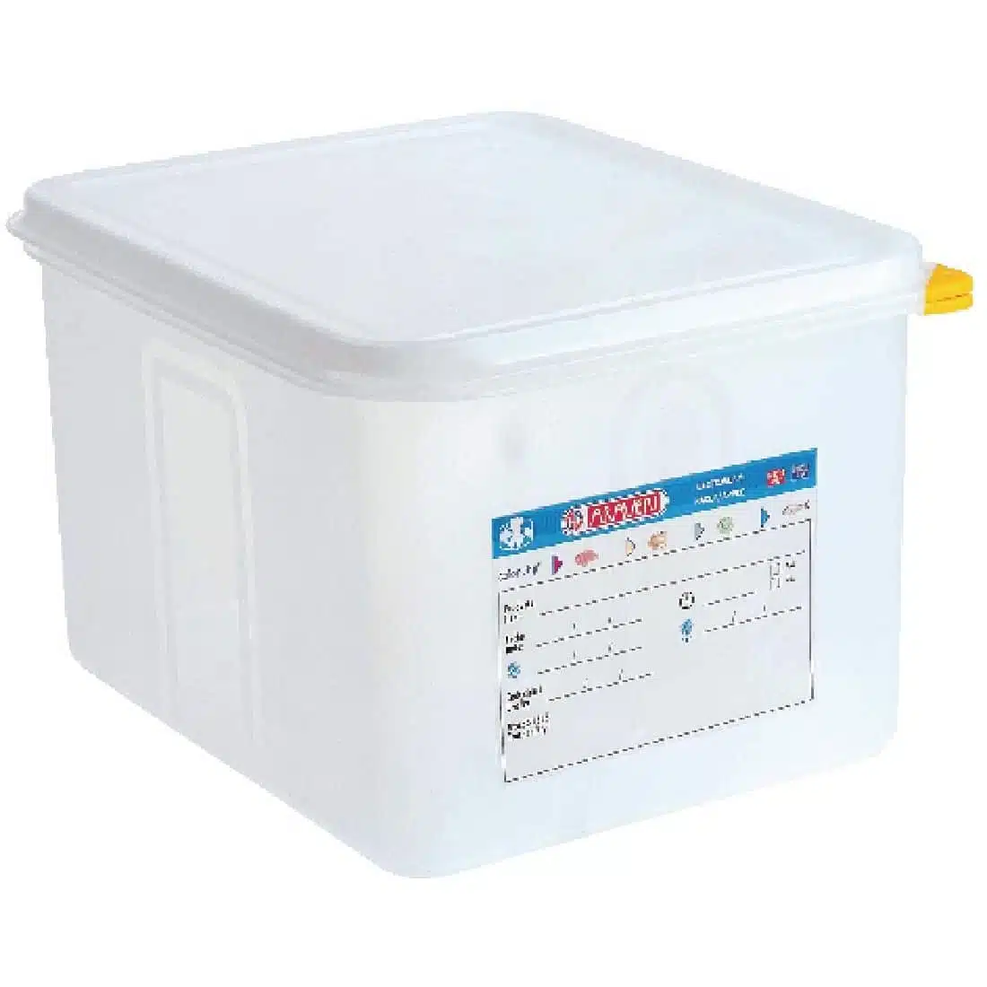 Colour coded airtight containers with lid. Sets of colour clips included (red, yellow, green & blue). Available in Gastronorm sizes.Temperature range -40°C to 95°C. Permanent wipe clean label fixed to each container, dishwasher proof.
