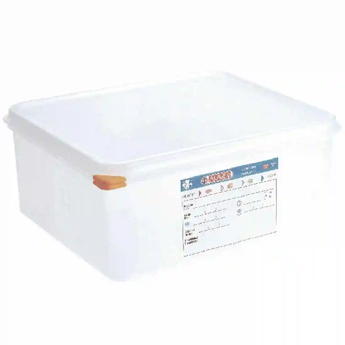 Colour coded airtight containers with lid. Sets of colour clips included (red, yellow, green & blue). Available in Gastronorm sizes. Temperature range -40°C to 95°C. Permanent wipe clean label fixed to each container, dishwasher proof.