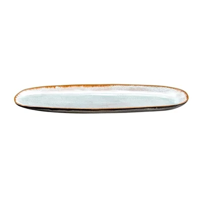 Part of the Médard De Noblat Shadow Aqua collection, these 355x140mm stoneware platters feature a stunning reactive glaze and an organic off-round shape that makes every piece unique. An aqua-toned interior contrasts beautifully with a textured anthracite exterior, accented by a warm golden-brown rim.
