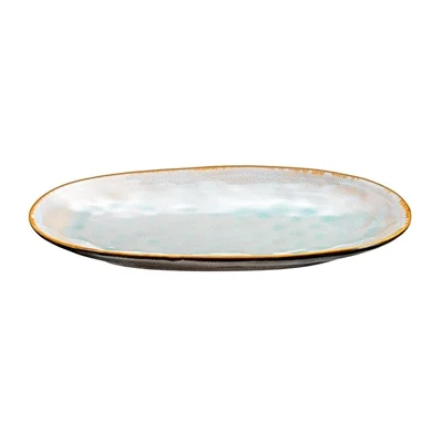 Part of the Médard De Noblat Shadow Aqua collection, these 360x220mm stoneware platters feature a stunning reactive glaze and an organic off-round shape that makes every piece unique. An aqua-toned interior contrasts beautifully with a textured anthracite exterior, accented by a warm golden-brown rim.