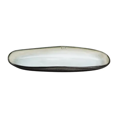 Part of the Médard De Noblat Shadow Pearl collection, these 230x110mm stoneware platters feature a stunning reactive glaze and an organic off-round shape that makes every piece unique. An aqua-toned interior contrasts beautifully with a textured anthracite exterior, accented by a warm golden-brown rim.