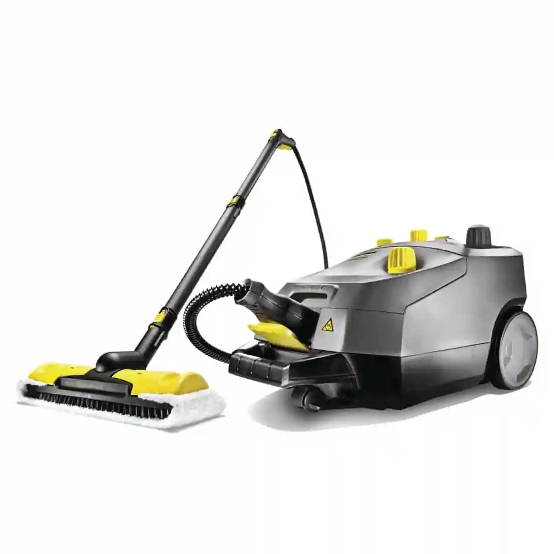 Professional steam cleaner provides cleaning without the use of chemicals. Twin water tanks permit quick heating up times and allow continuous operation as the unit can be topped up during operation. Trolley available separately for greater mobility and storage. Ergonomically designed handle.