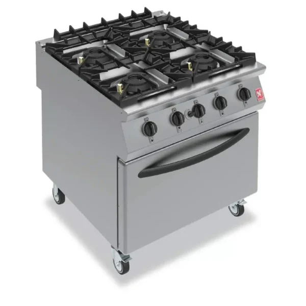 The G9184B four burner oven range is ideal for any kitchen. Three powerful 9.5kW burners and one 4.2kW burner, individual cast iron pan supports and manufactured from 304 culinary grade stainless steel ensures it can withstand the harshest of kitchen environments. A one-piece pressed hob with deep drawn wells that contain spillages, wide raised corners to prevent build up of grease and grime and sealed burner wells make the unit easy to clean and keep clean.