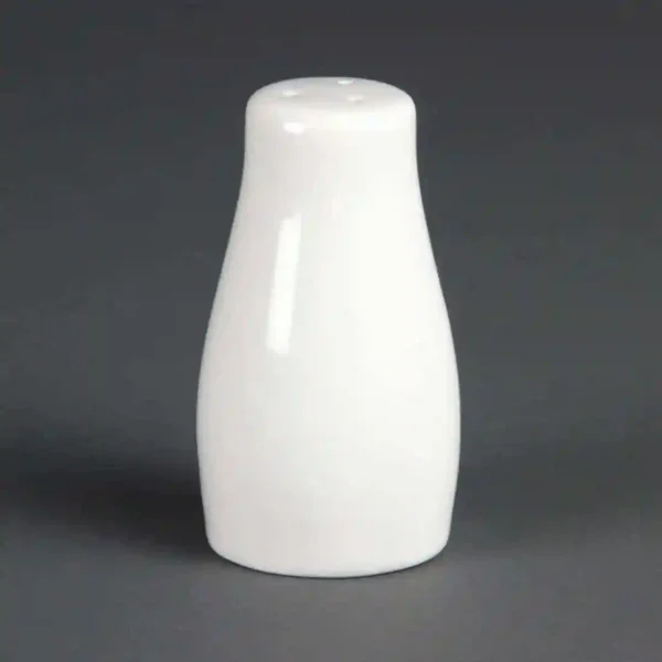 Great value pure white porcelain elegant salt shakers by Olympia, ideal for all catering establishments. Sold separately from pepper shakers, all are made with strengthened rolled edges for chip resistance and longevity.