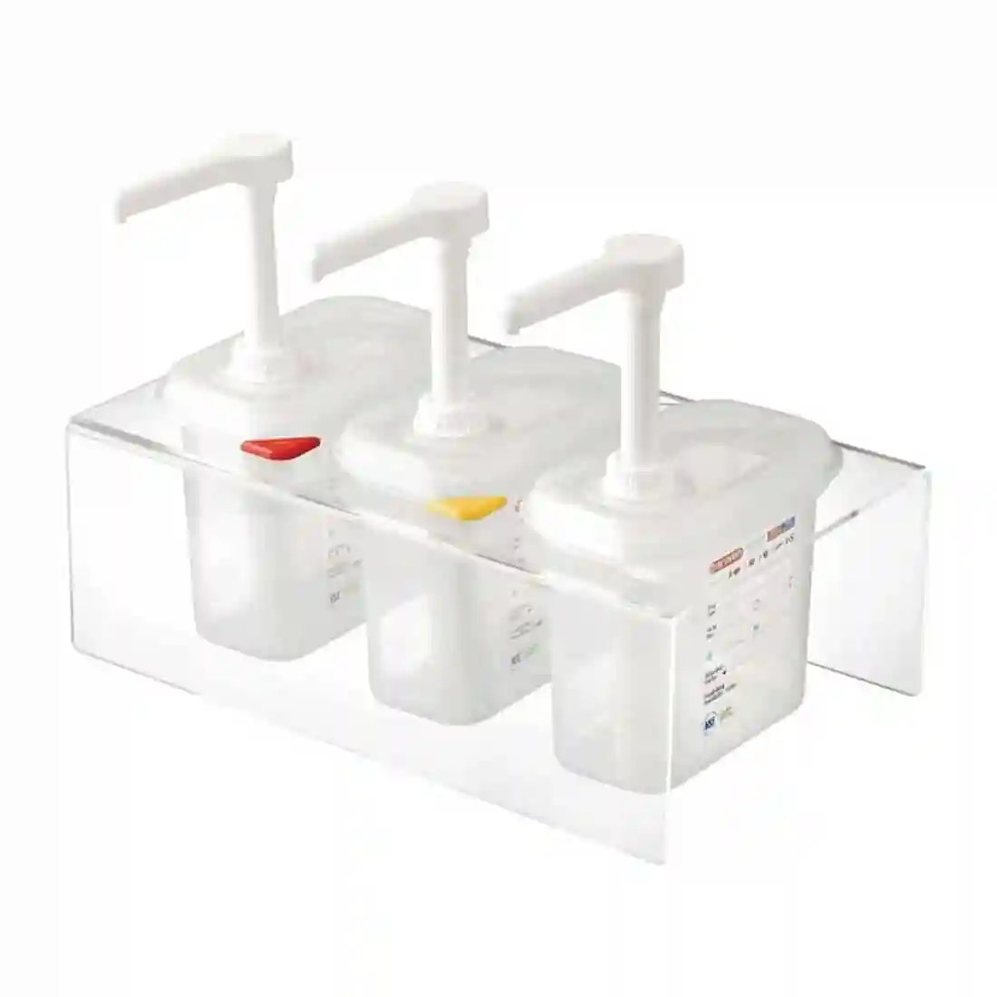 This trio of sauce dispensers from Araven have easy-to-use hand pumps and shut-off valves that provide wasteless dosage of sauces, syrups and dressings to ensure your service runs efficiently. GN 1/9 sized, each dispenser also fits perfectly into food service and storage areas, helping you to maintain practicality and efficiency through every service. These easy-to-clean plastic sauce containers make it easy for you to maintain a hygienic kitchen from beginning to end of service. 1.5L to brim, marked to 1.25L.