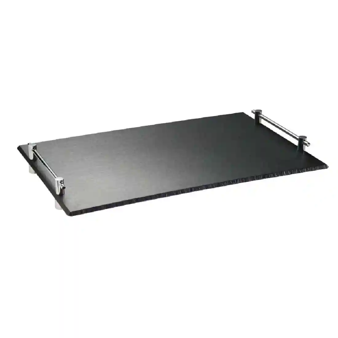Melamine tray in slate effect. Chrome plated handles allow stacking for easy storage and transportation.