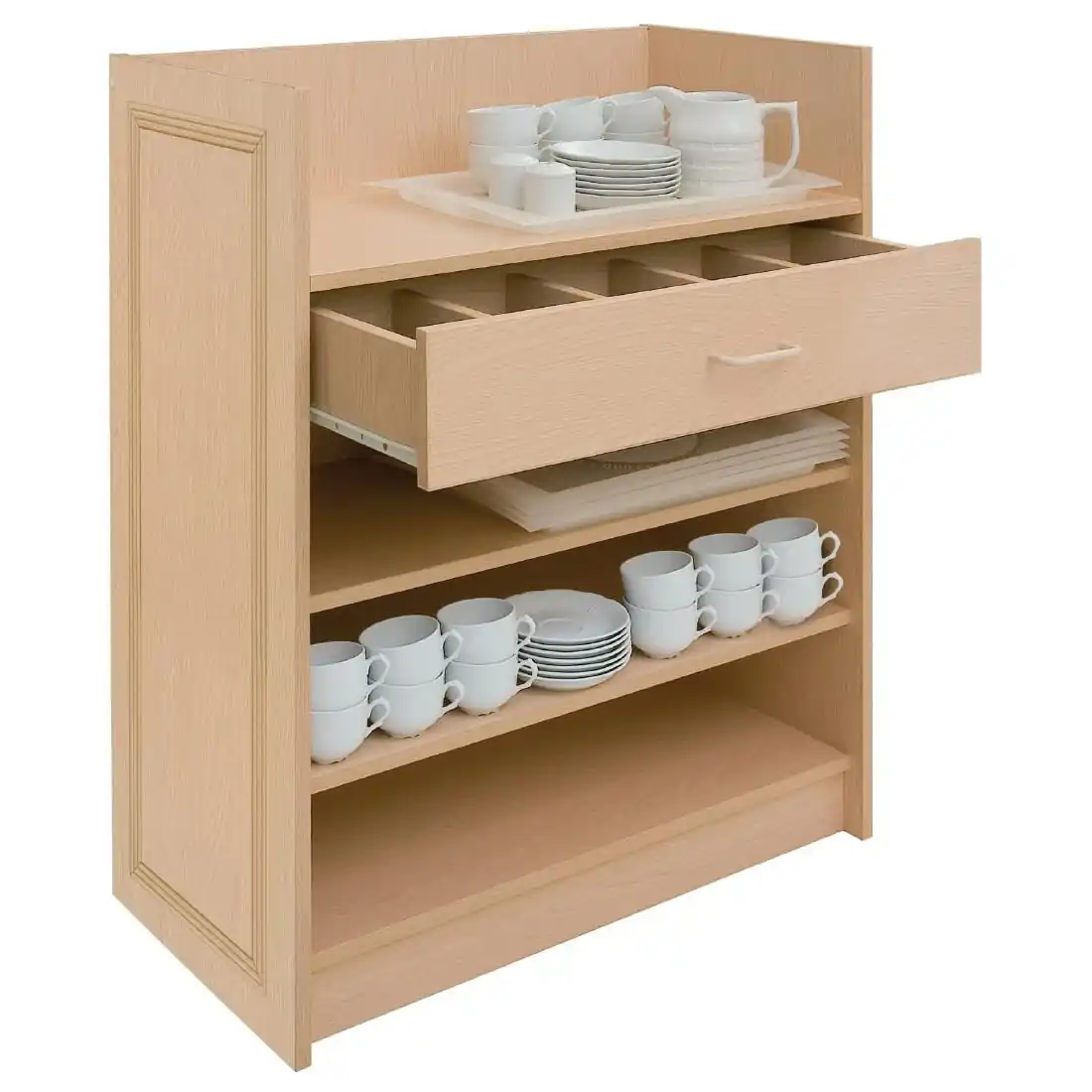 Elegant and practical yet heavy-duty dumb waiters with wipe-clean melamine surfaces and impact resistant edging, ideal for front of house storage of cutlery and crockery in restaurants, cafés and pubs. Divided, lined drawers for safe storage of cutlery and lower cupboards with doors and three shelves for crockery etc.