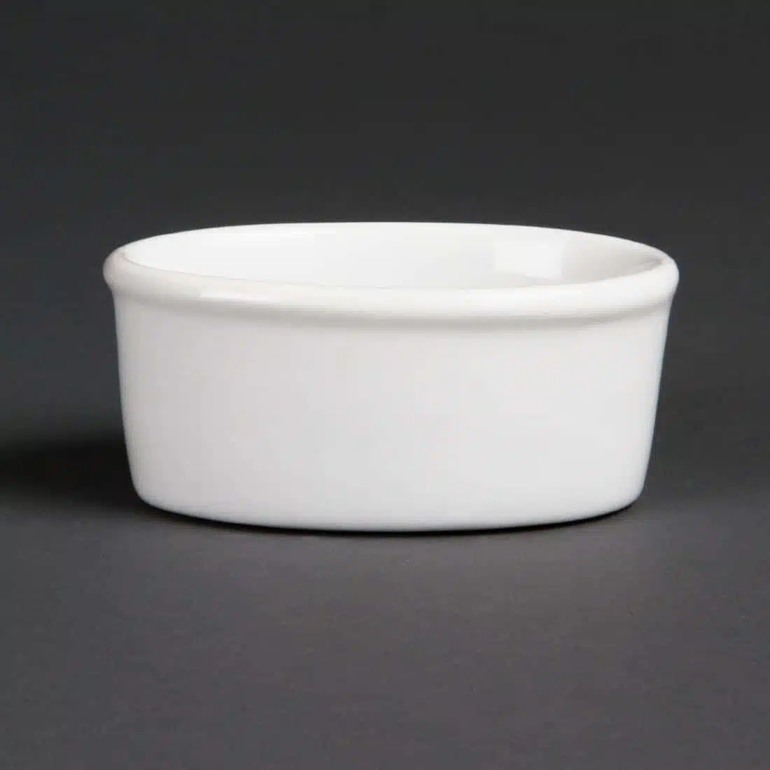 This white, 4″ oval ramekin from Olympia is designed to provide a great value and hardwearing porcelain crockery solution for busy hotels, canteens, casual dining restaurants and cafes. Strengthened rolled edges ensure the ramekin is chip resistant and the fully vitrified body gives great glaze durability, making it ideal to withstand the rigours of the professional catering environment. The ramekin is oven, microwave, dishwasher and freezer proof.