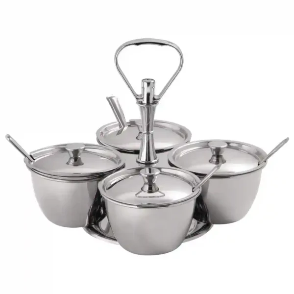 Polished stainless steel revolving stand with four bowls, ideal for serving condiments and sauces from the table centre.
