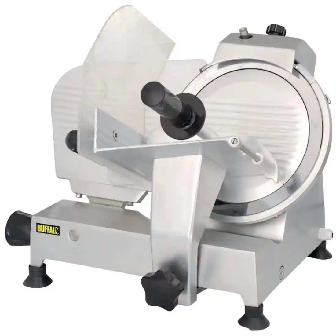 Exceptional cutting strength for large volumes of cooked and cold meats. The food carriage is mounted on ball bearings to ensure smooth gliding action and thickness is manually controlled with side dial.