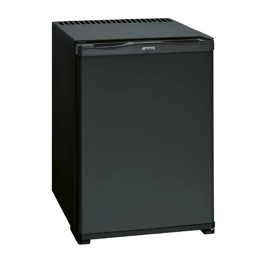 Smeg freestanding minibar, ideal for various applications such as hotel/guest rooms, offices and domestic use. Using thermo-electric refrigeration for quiet and efficient operation. Energy consumption is 161KWh/year. With an adjustable door shelf, 1 bottle shelf, 2 adjustable glass shelves and 40 litre capacity there is ample room for drinks and snack, with an internal LED light to give a clear view. The door is reversible for ease of installation and the mini bar can be used freestanding or integrated into a cupboard.