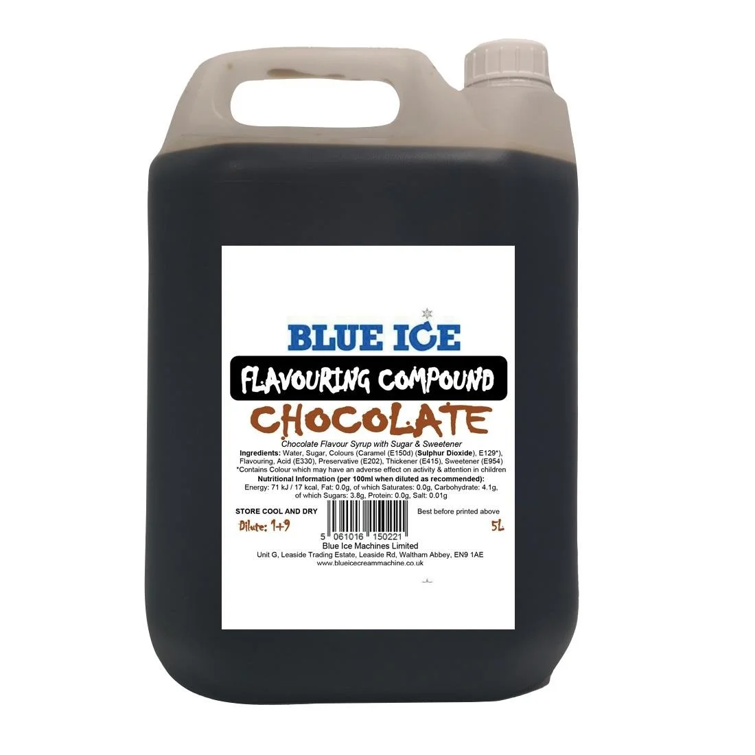 Add delicious flavour to your ice creams or milkshakes with this chocolate flavouring compound from Blue Ice. Presented in a 5 litre bottle, the compound can be used with hard ice cream together with a blender to make milkshakes.