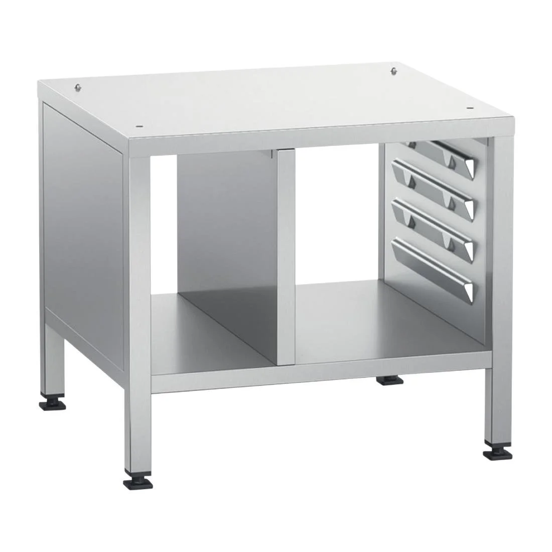 Our oven stands and base units are made of high-quality, robust stainless steel, and provide secure support for your RATIONAL appliance. All of our oven stands and base units comply with the strictest hygiene standards. 4 pairs of supporting rails with a storage compartment. Side walls and top closed, rear side open.