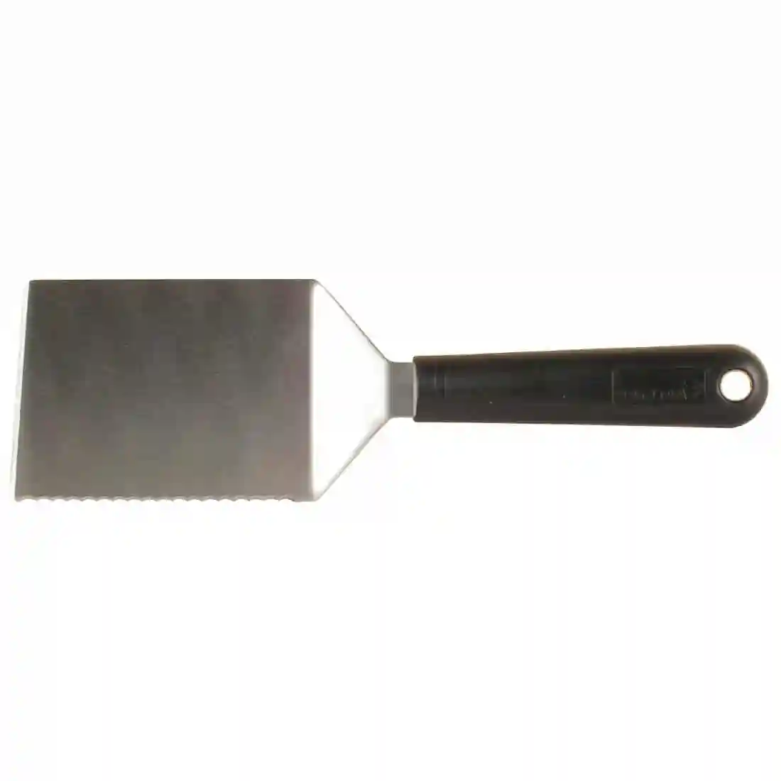 Stainless steel. Features a serrated edge.