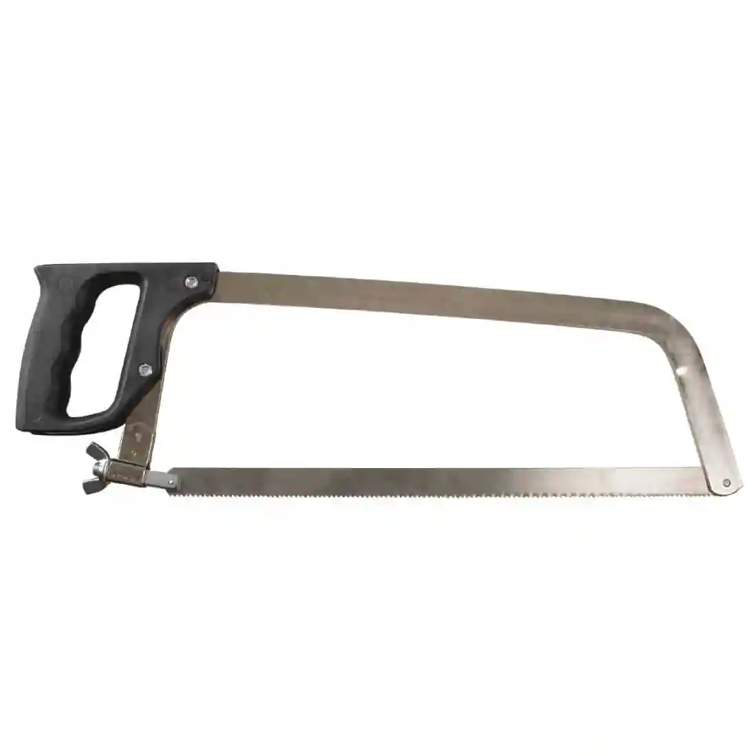 This stainless steel framed crosscut Bow Saw features a coarse 14″ blade, and a firm black plastic handle, the ideal cutting utensil for butchers.