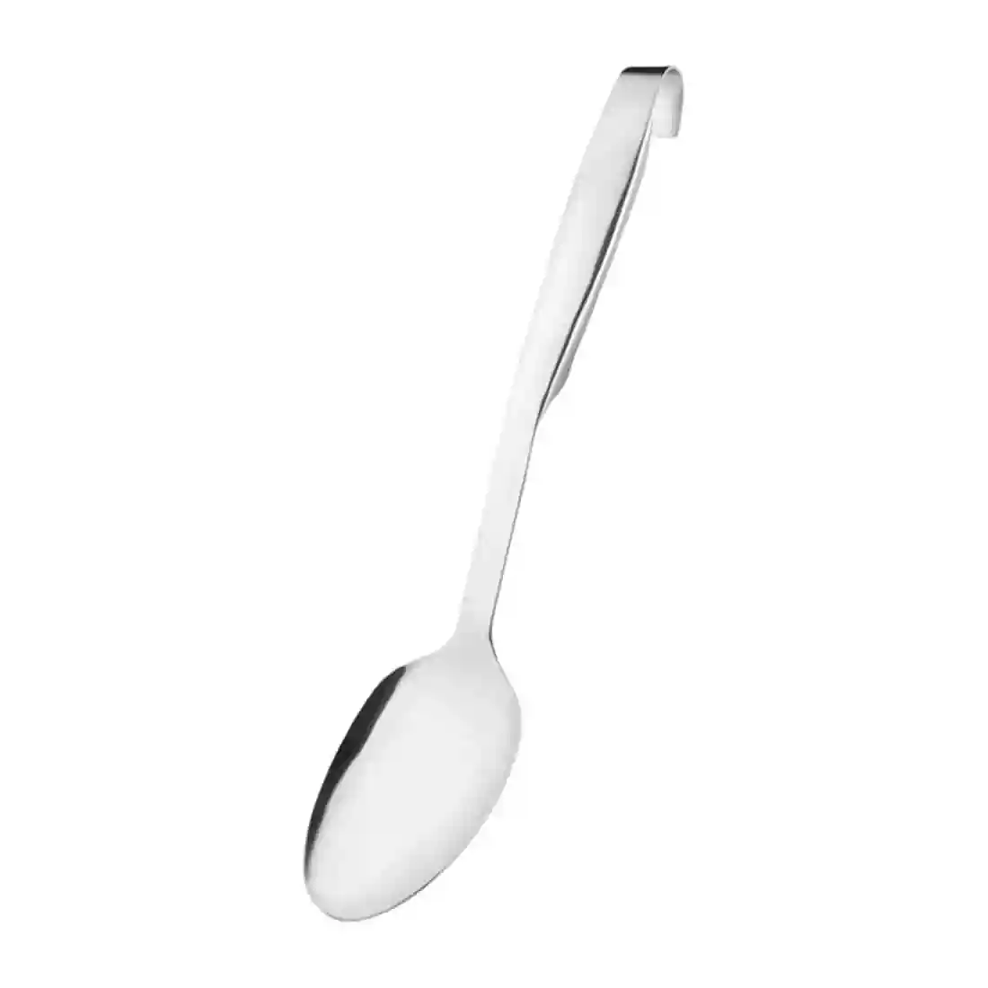 Stainless steel plain spoon with hanging hook. Dishwasher safe.