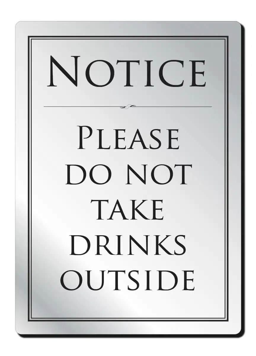 Politely notify customers not to take their drinks outside with this bar sign. The aluminium make up of this metal sign means that it not only looks great, but it will last a very long time. These signs are compliant with UK Licensing laws.