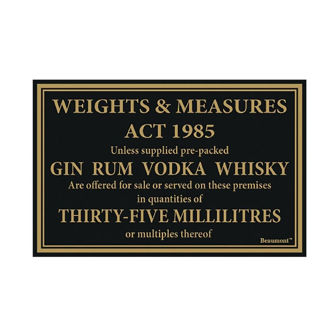 Clearly communicate compliance with laws around serving spirit by the measure with this highly visible sign from Beaumont. The black board with gold letter design is easy to read, whilst still having a subtle, elegant style. Easy to apply.