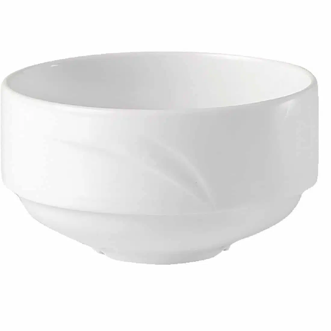 With flowing curves and a subtle embossment, the Alvo crockery range assures outstanding food presentation to complement any cuisine. This 10oz soup bowl, without handles, combines the pure white delicacy and translucence of finest china with exceptional durability, with features including thermal shock and stain resistance and a robust glaze.