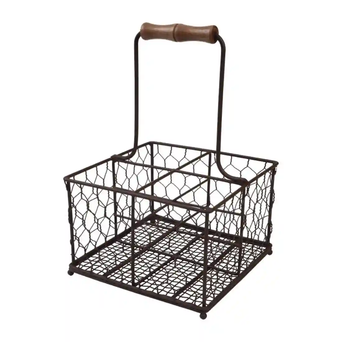 Made using a tough steel wire frame and chicken wire for the walls, this basket offers a rustic and homely look. Coated with a dark brown finish that complements the real wood handle, this is a basket for restaurants looking for a stylish way to carry sauces to the table.