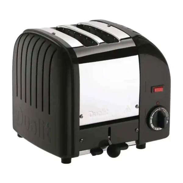 A versatile, stylish two slot Dualit toaster with a black finish and extra wide 28mm slots to accommodate a variety of breads. Create in the classic Dualit design, a manual selector switch allows you to use just the slots you need, whilst a simple turn-control timer ensures bread is browned to perfection. The adjustable rear foot can be turned by hand to raise or lower the toaster, to compensate for uneven work surfaces. The removable crumb tray and wipe down surfaces ensure the toaster is easy to clean, and easily replaceable ProHeat elements give the machine a long life.