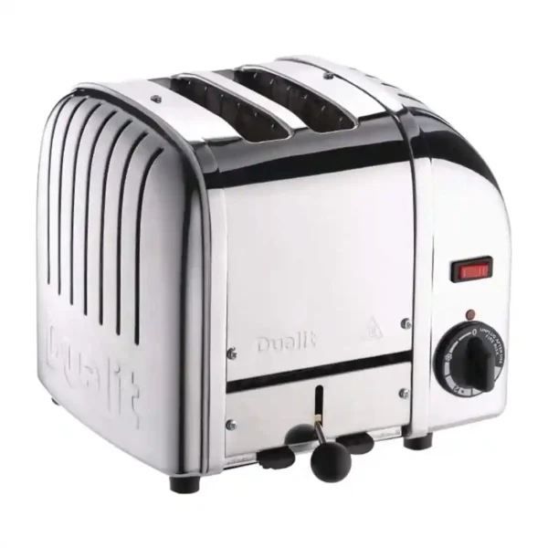 A versatile, stylish two slot Dualit toaster with a stainless plus finish and extra wide 28mm slots to accommodate a variety of breads. Create in the classic Dualit design, a manual selector switch allows you to use just the slots you need, whilst a simple turn-control timer ensures bread is browned to perfection. The adjustable rear foot can be turned by hand to raise or lower the toaster, to compensate for uneven work surfaces. The removable crumb tray and wipe down surfaces ensure the toaster is easy to clean, and easily replaceable ProHeat elements give the machine a long life.