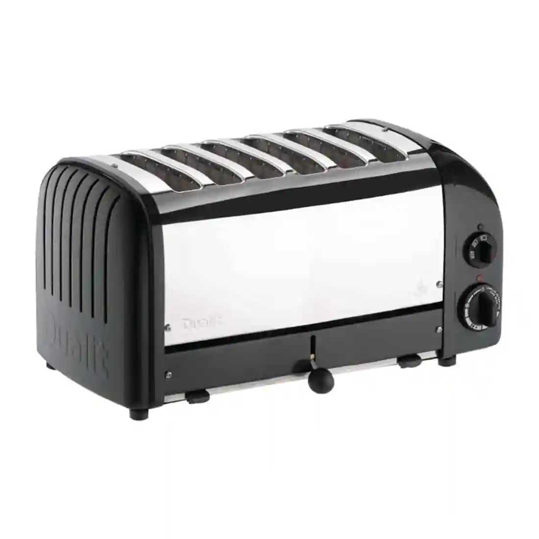 A versatile, plug-in Dualit toaster with six slots, allowing for a high output of toasted bread, whether used in a domestic or commercial kitchen. This stylish, iconic toaster is finished in standard black and makes an excellent, long-lasting addition to any kitchen thanks to its hard-wearing, sturdy structure and easily replaceable ProHeat elements. Use only the slots required with a simple selector switch, whilst the simple timer ensures bread is toasted to desired outcome.