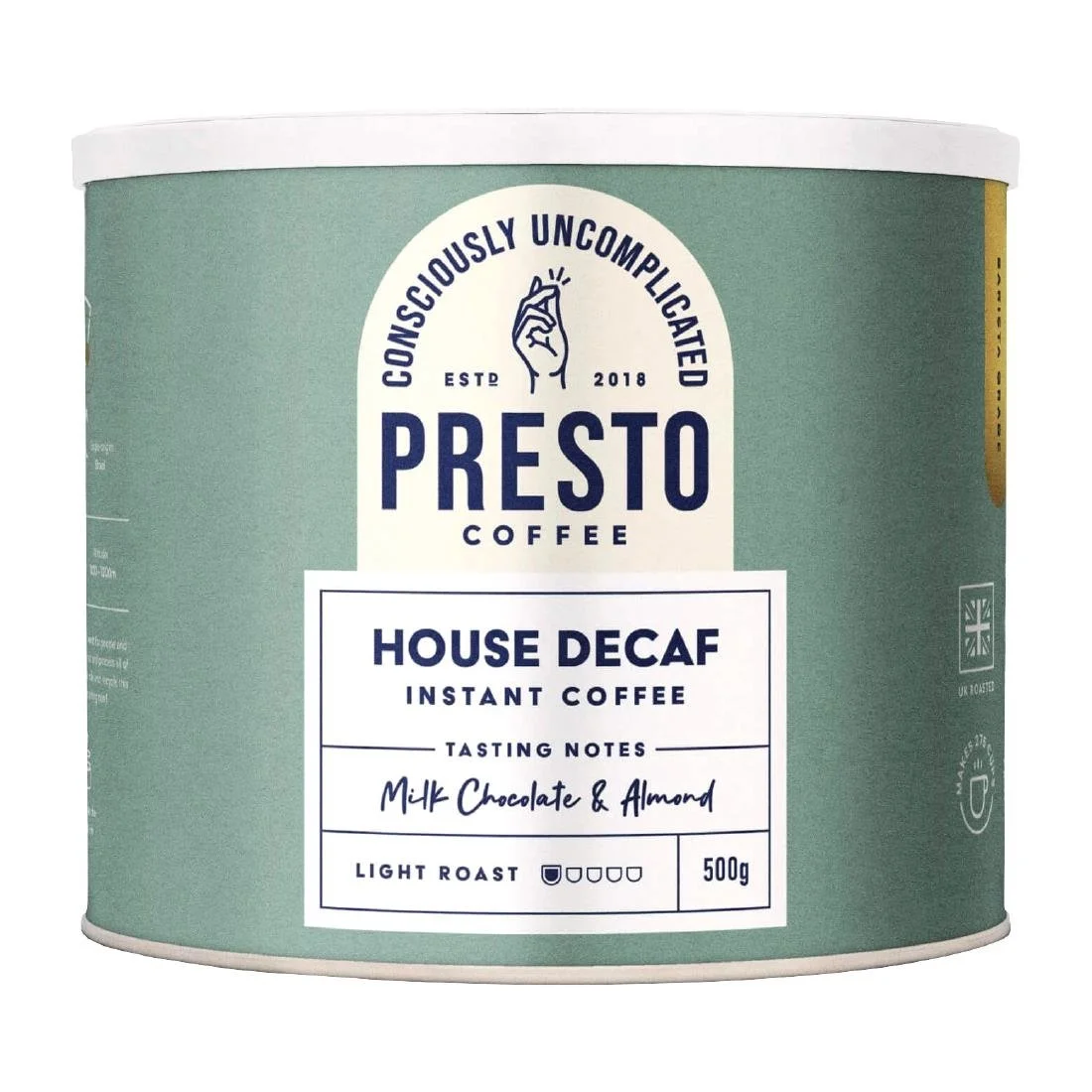 Enjoy barista-quality coffee anytime, anywhere with Presto’s House Decaf instant coffee. This premium freeze-dried single-origin Arabica coffee features delicate flavour notes of milk chocolate and almonds.
