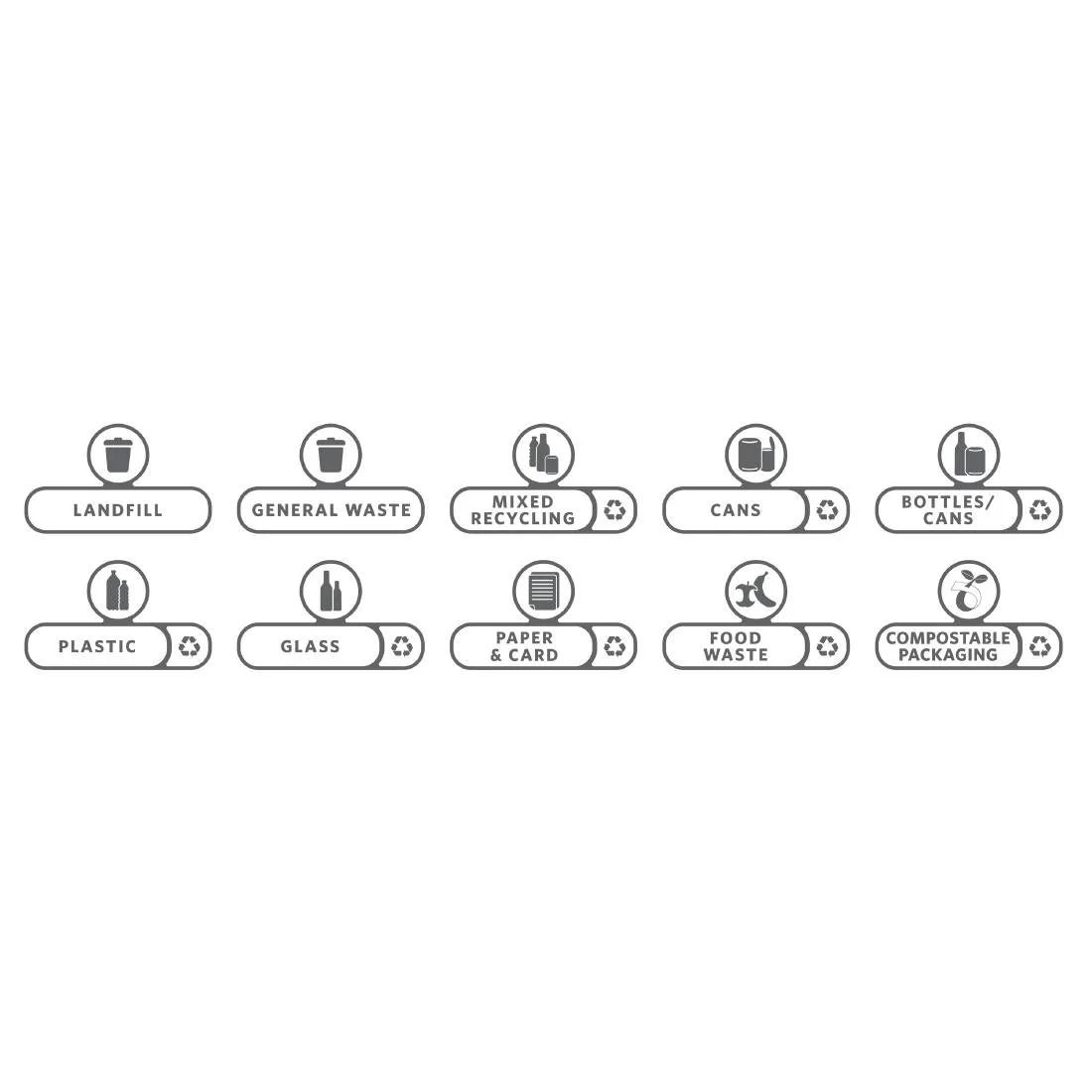 - For every kind of waste: Each label kit includes the following ten waste stream decals: Landfill, General Waste, Mixed Recycling, Paper & Card, Plastic, Glass, Cans, Bottles/Cans, Compostable Packaging and Food Waste