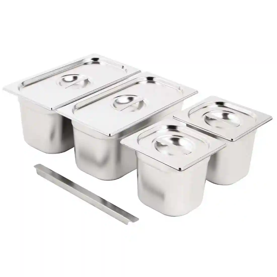Ideal for schools, hotels and office canteens, this set of gastronorm pans can be used for a large variety of catering tasks including cooking, storage, reheating, transportation, blast chilling and presentation. Built from high quality stainless steel, they are incredibly tough making them suitable for constant use. Also reduce your cleaning times as they can be taken straight from the cooker to the freezer to the bains marie with no need for transferring to another pan. This set includes two 1/3 pans, two 1/6 pans complete with appropriate lids for each pan and an adaptor support bar. For use with L371 and L310 Buffalo Bain Maries.