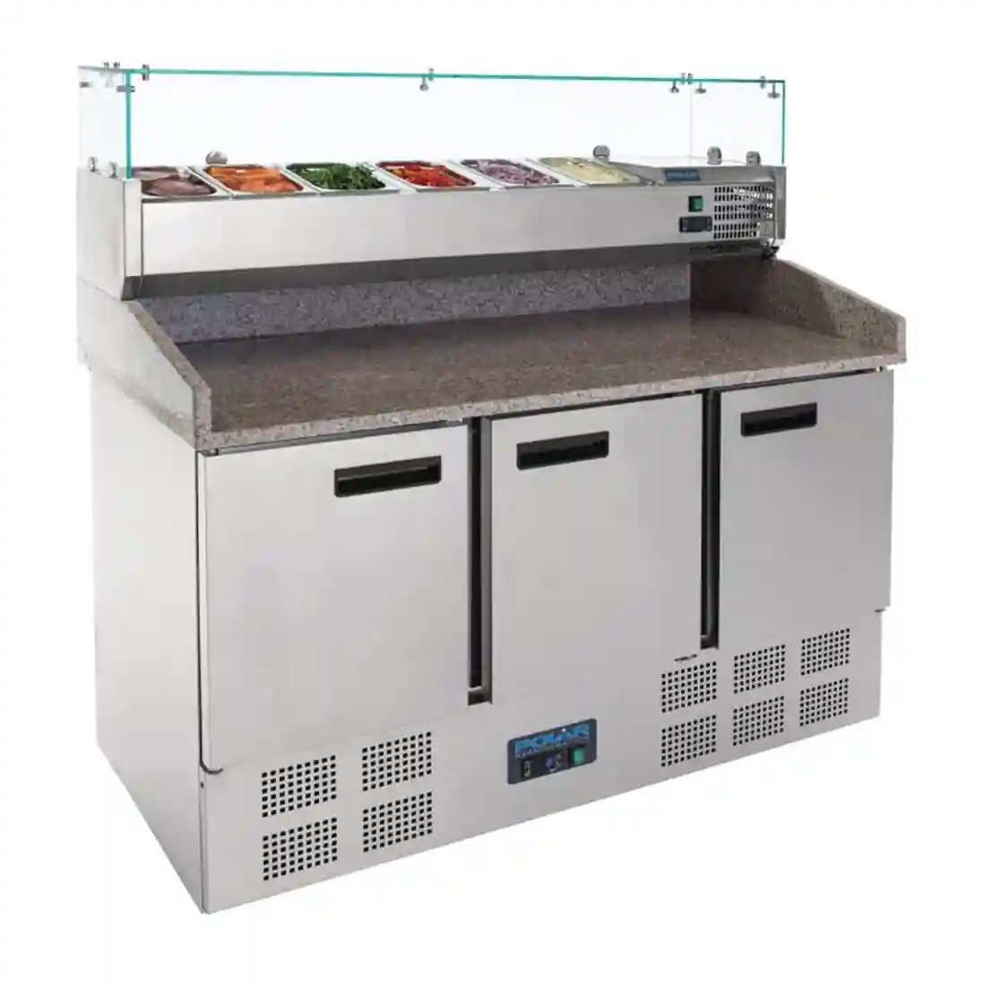 If you’re making pizza, salads, wraps, sandwiches or other similar fast-prep foods, the Polar G-Series pizza prep counter provides the ideal reliable refrigerated prep station. A high capacity unit, you can store large quantities of chilled food behind the three stainless steel doors, whilst the sturdy servery unit on top ensures rapid access to frequently used chilled ingredients. The robust marble worktop is absolutely ideal for pizza prep, as the stay-cool material makes kneading dough mess-free.