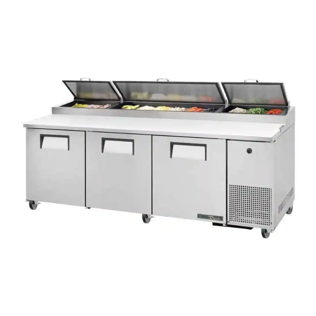 With a five year warranty as standard, the TPP-93 True 3 door pizza prep counter fridge is an environmentally friendly yet powerful addition to takeaways, restaurants, hotels and pizzerias and has been designed for efficiency and impressive reliability. The advanced insulation helps to retain a consistent temperature behind the robust double doors, saving both energy and running costs, as well as helping to retain the quality of the food. The removable chopping board adds extra functionality and ensures that making pizza or sandwiches is simple thanks to the easily accessible ingredients. Supplied with six adjustable heavy duty shelves and twelve 1/3rd size gastronorm pans.
