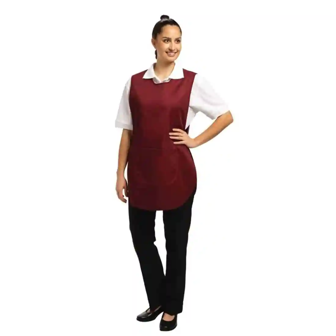 Easy-care polycotton blend tabard with pocket and popper side fastening.