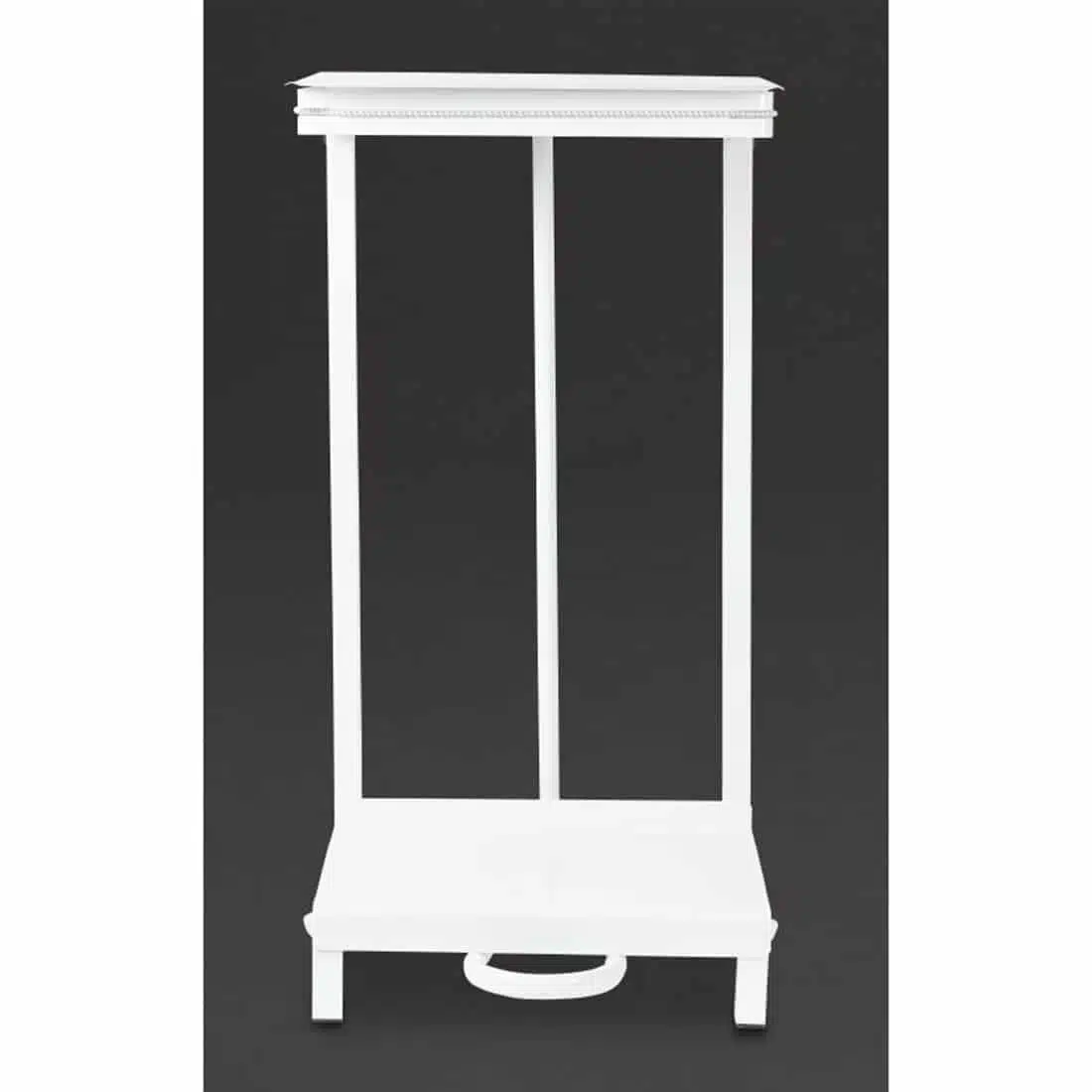Free-standing pedal operated sack holders in white painted steel. There is a foot control pedal which opens the lid for hygienic hands free use.